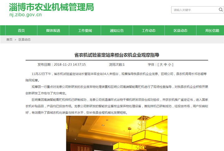 2018年11月22日山东省农机鉴定站、淄博市农业机械管理局来我公司山东银河999小玛丽水果游戏机械考察,观摩团一行对我公司新研发的有机废气物好氧发酵装置进行了现场检查指导,对我公司的工作给与了充分的肯定。